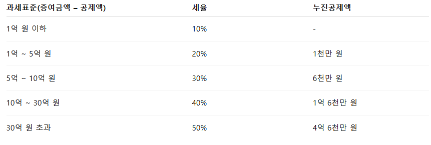 비과세 한도를 초과하면 증여세를 내야 합니다. 증여세는 누진세율 구조로, 금액이 클수록 세율이 높아집니다.